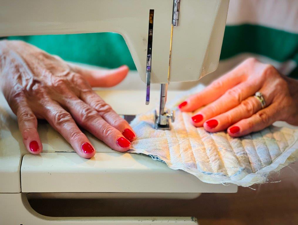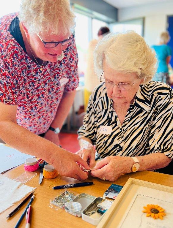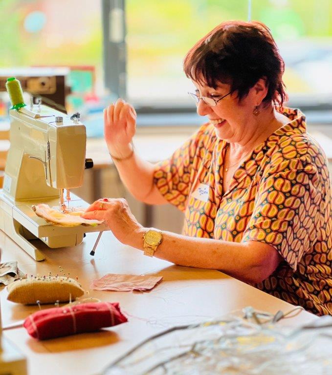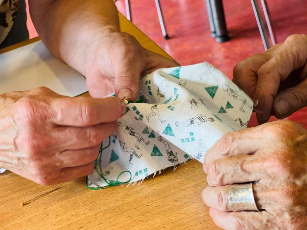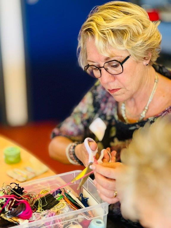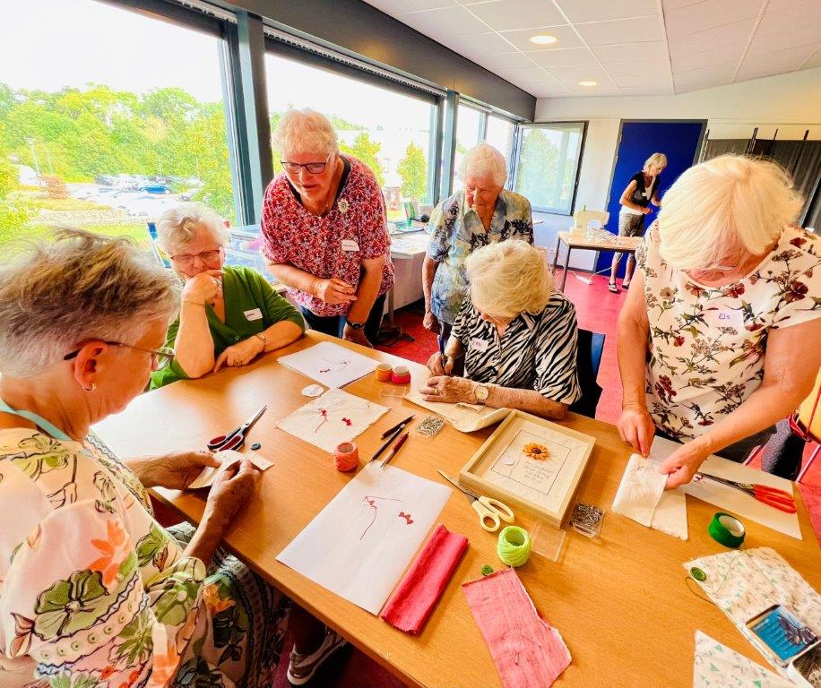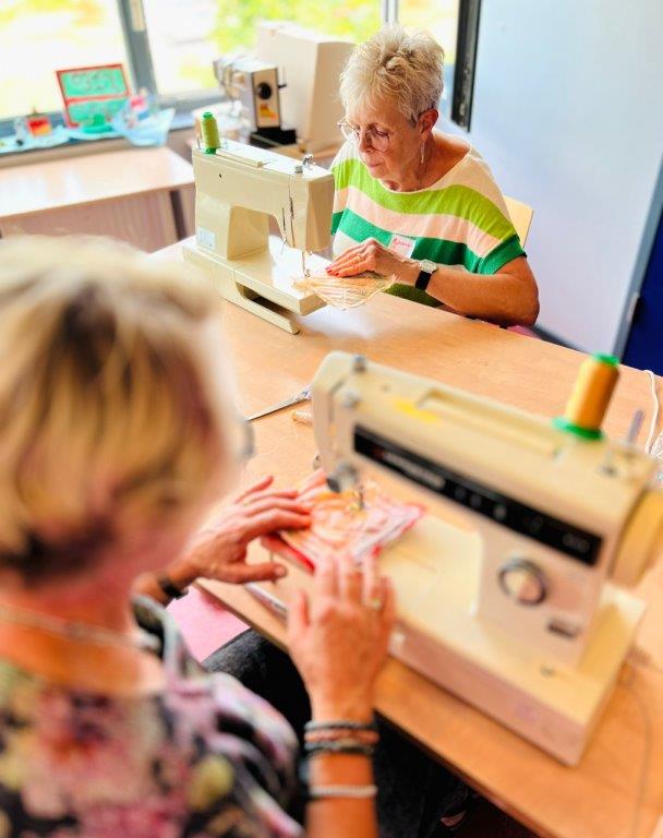 Als het kan wordt er tijdens een bijeenkomst soms ook een workshop gegeven. Vrijdag 6 september jl. was het een onderwerp dat prima bij de naaiateliers past namelijk ‘hoe jouw favoriete kledingstuk te pimpen’. Onder begeleiding van Marianne Neerlaar en Nel van der Meulen – beiden vrijwilliger bij Lang Leve Kunst en Naoberschap van Amphion Cultuurbedrijf voor textiele projecten zoals ‘Draadjeswerk’ – kwamen de mooiste creatieve ideeën tot stand.