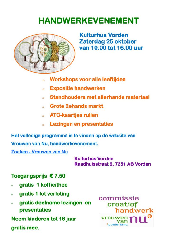De Commissie Creatief Handwerk Vrouwen van Nu afdeling Gelderland organiseert een groots handwerkevenement op zaterdag 25 oktober 2025 in het Kulturhus Vorden. Tussen 10.00 en 16.00 uur kunnen geïnteresseerden diverse stands bezoeken, workshops volgen, lezingen bijwonen en presentaties bekijken. Naaiatelier Kieskleurig staat met een kraam vol producten en tweedehands materialen en Désirée Kester zal tussen 15.00 en 15.30 uur bevlogen vertellen over de oprichting van de – inmiddels 10 -naaiateliers. De entreekosten zijn gering. Voor slechts € 7,50 heeft u toegang en dat is ook nog eens inclusief een kopje koffie of thee en een gratis lot voor de loterij.